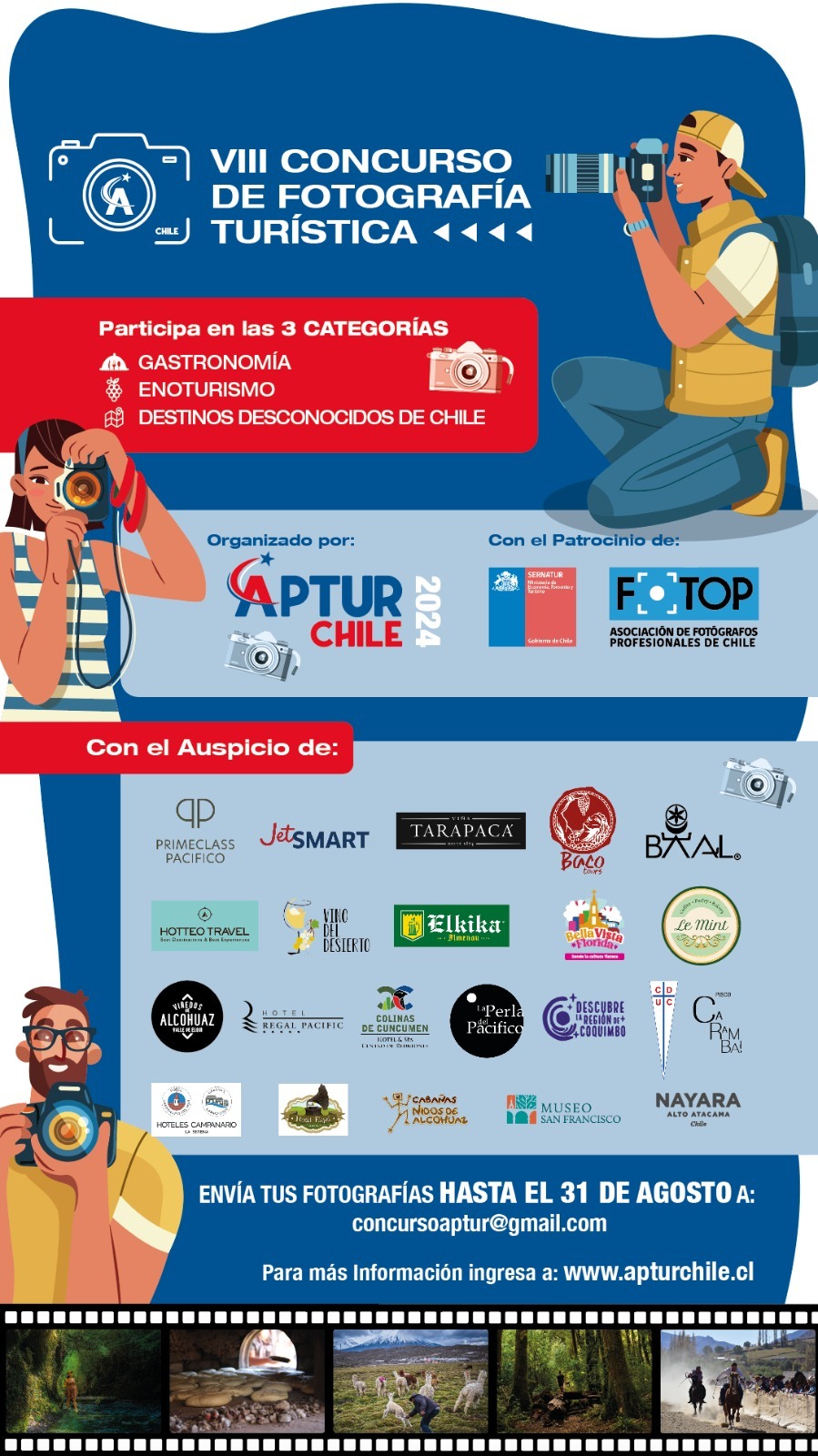 Cada competidor puede presentar un máximo de 3 fotografías al concurso [en formato JPG] en un mail personal del concursante que debe ser dirigido a concursoaptur@gmail.com . No olvides leer las bases del concurso, disponibles en la web de www.apturchile.cl